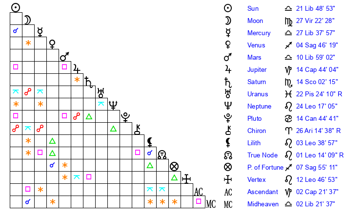 | Moon | 27 Virgo 25 | 16 Leo 31 | 5 Gemini 47 |