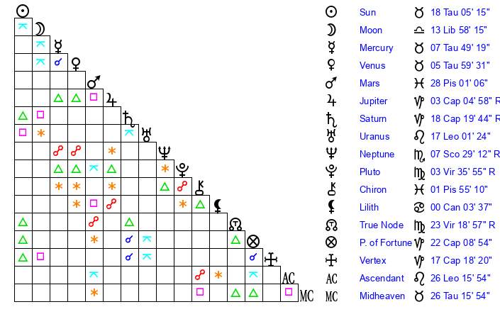 | Neptune | 7 Scorpio 28 | 1 Aries 19 | 6 Scorpio 21 |