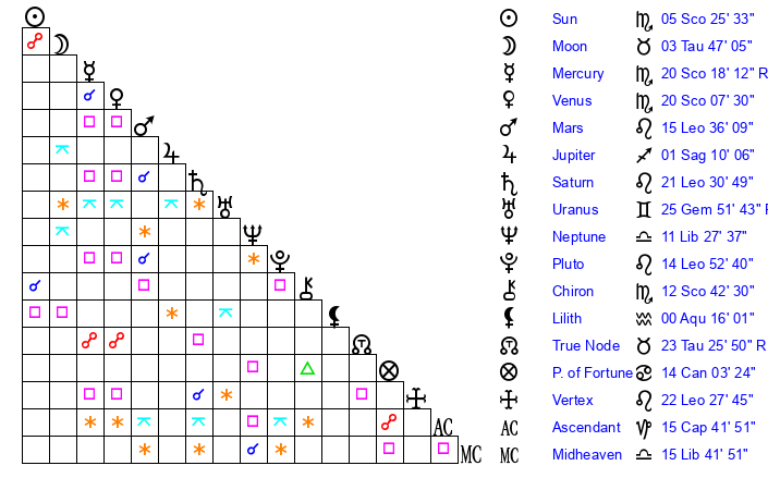 | Neptune | 11 Libra 28 | 29 Pisces 49 | 12 Libra 59 |