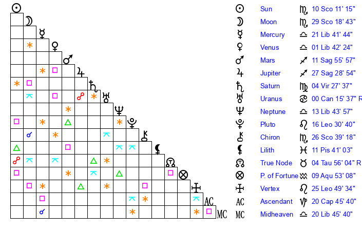 | Neptune | 13 Libra 44 | 29 Pisces 44 | 15 Libra 10 |