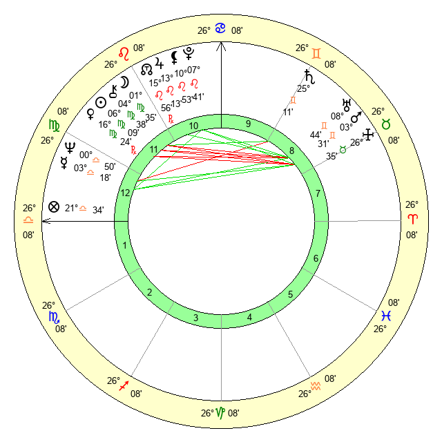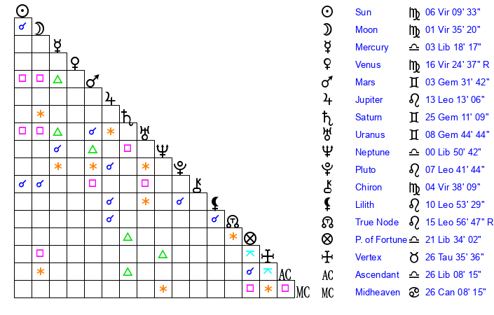 Moon | 1 Virgo 41 | 28 Scorpio 0 | 2 Virgo 16 |