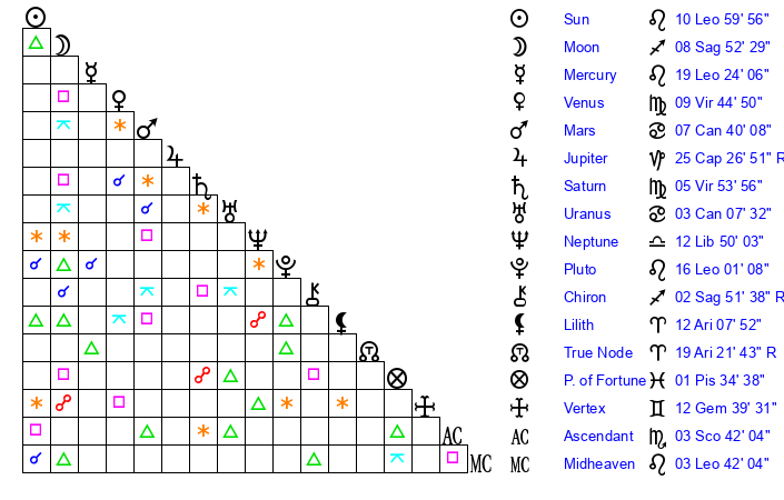 | Mercury | 19 Leo 25 | 7 Leo 4 | 6 Libra 51 |
