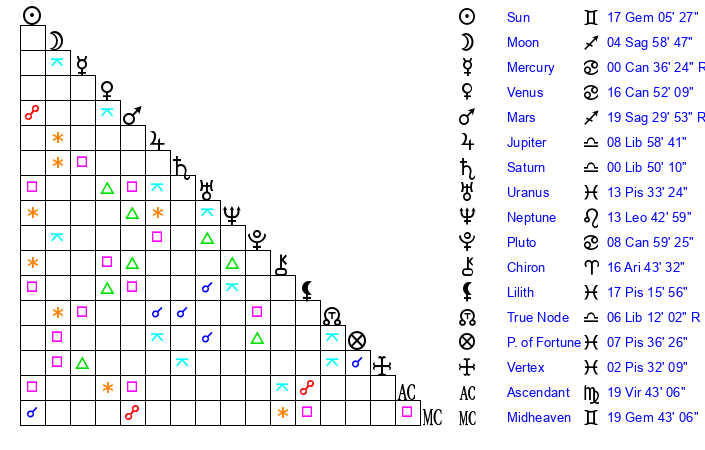 | Moon | 4 Sagittarius 56 | 19 Scorpio 2 | 4 Virgo 52 |