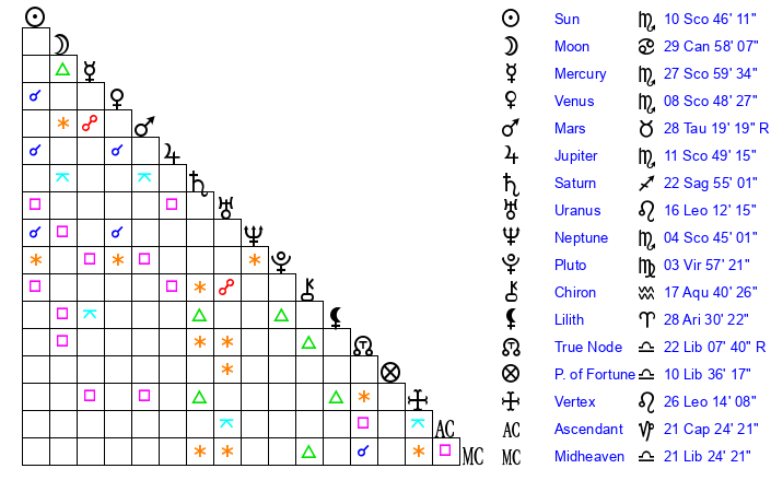 | Sun | 10 Scorpio 46 | 11 Scorpio 31 | 18 Capricorn 41 |