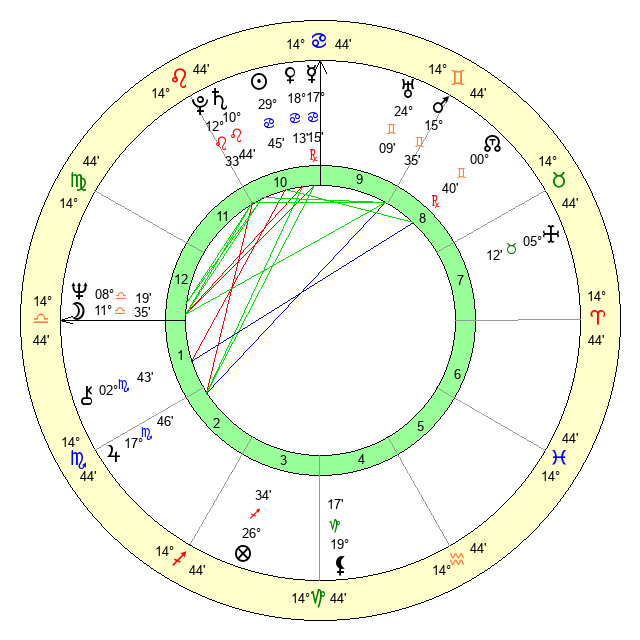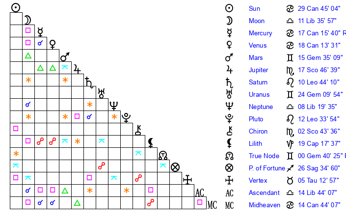 | Moon | 11 Libra 45 | 13 Cancer 16 | 12 Leo 1 |