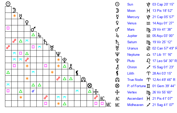 | Moon | 13 Pisces 24 | 5 Pisces 18 | 24 Sagittarius 46 |