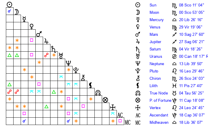 | Sun | 8 Scorpio 11 | 8 Scorpio 31 | 26 Capricorn 16 |