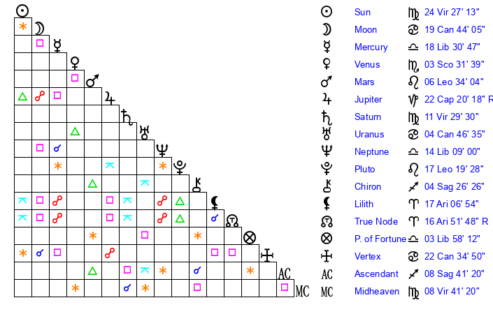 | Sun | 24 Virgo 27 | 25 Virgo 3 | 10 Sagittarius 12 |