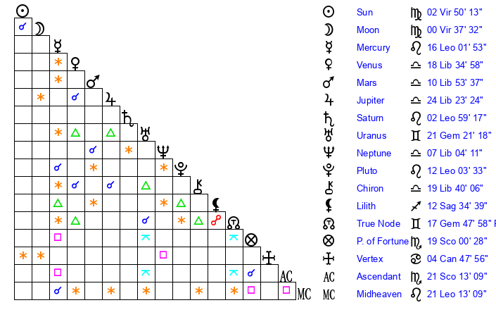 | Moon | 0 Virgo 34 | 13 Libra 44 | 21 Cancer 30 |