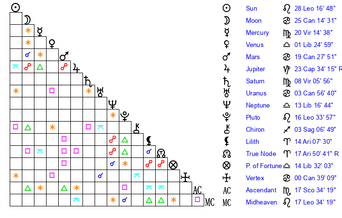 | Pluto | 16 Leo 34 | 1 Aquarius 57 | 18 Leo 9 |