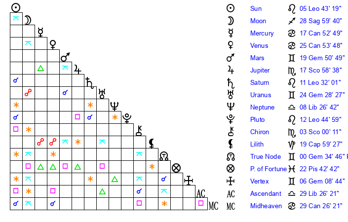 | Mercury | 17 Cancer 53 | 10 Leo 41 | 16 Scorpio 17 |