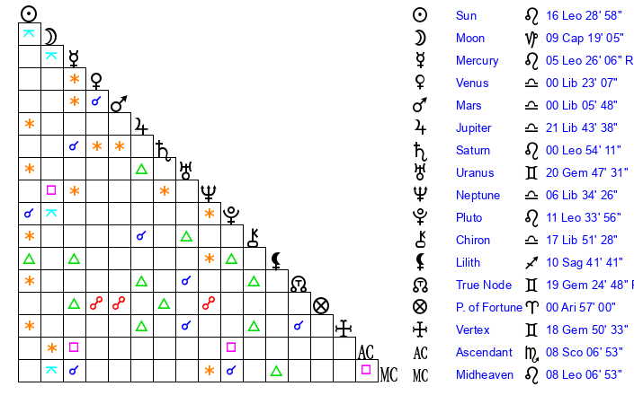 | Sun | 16 Leo 29 | 17 Leo 21 | 3 Scorpio 40 |