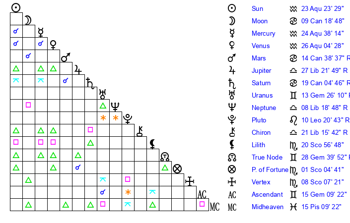 | Sun | 23 Aquarius 24 | 24 Aquarius 14 | 11 Taurus 41 |