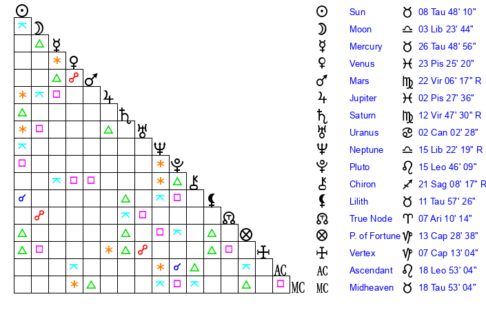 | Saturn | 13 Virgo 20 | 27 Pisces 37 | 15 Virgo 54 |