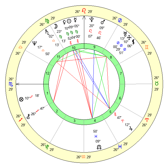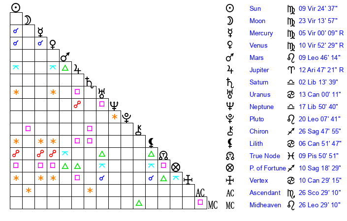 | Venus | 10 Virgo 52 | 9 Leo 36 | 5 Libra 54 |