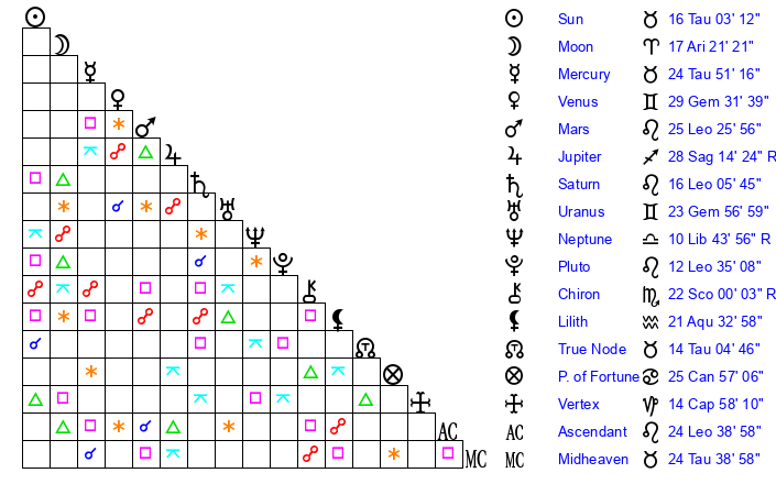| Saturn | 16 Leo 34 | 28 Pisces 19 | 23 Leo 8 |