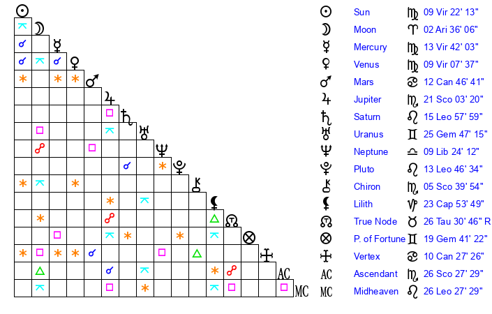 | Mercury | 13 Virgo 43 | 0 Virgo 17 | 7 Scorpio 18 |