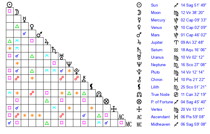 | Pluto | 14 Virgo 12 | 2 Aquarius 3 | 13 Virgo 33 |