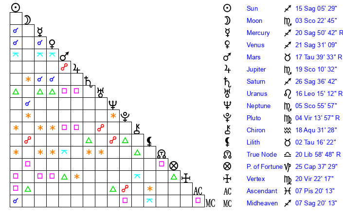 | Neptune | 5 Scorpio 55 | 29 Pisces 22 | 6 Scorpio 56 |
