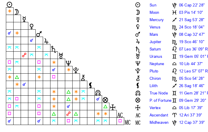 | Moon | 3 Pisces 15 | 10 Sagittarius 59 | 16 Capricorn 5 |