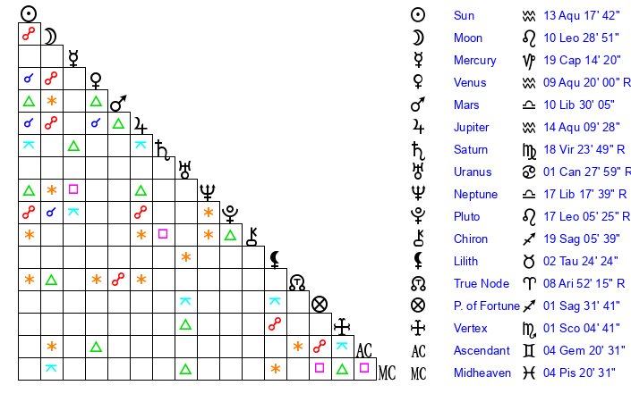 | Pluto | 17 Leo 4 | 2 Aquarius 6 | 15 Leo 47 |