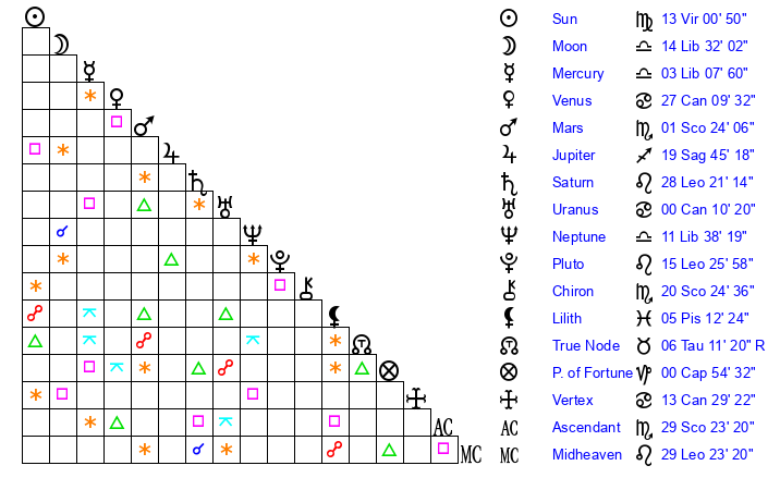 | Sun | 13 Virgo 1 | 13 Virgo 23 | 29 Scorpio 18 |