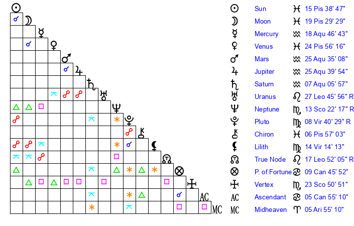 | Moon | 19 Pisces 33 | 16 Gemini 40 | 15 Cancer 34 |