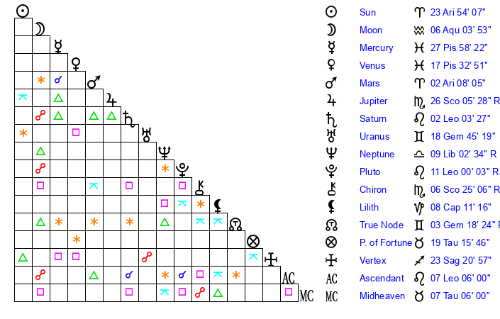 | Sun | 23 Aries 54 | 25 Aries 0 | 9 Cancer 0 |