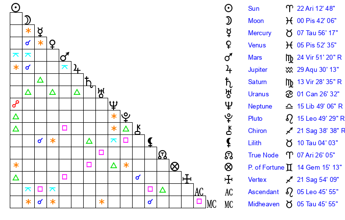 | Saturn | 14 Virgo 2 | 25 Pisces 47 | 14 Virgo 35 |