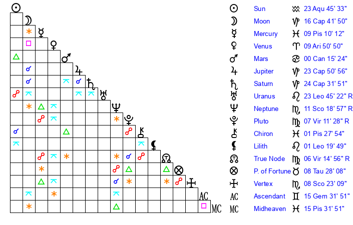 | Saturn | 24 Capricorn 49 | 18 Pisces 40 | 29 Capricorn 45 |