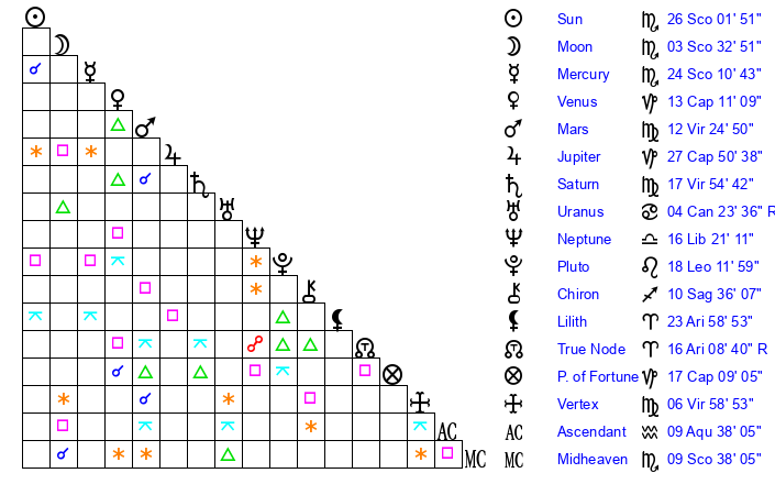 | Sun | 26 Scorpio 2 | 26 Scorpio 36 | 13 Aquarius 18 |