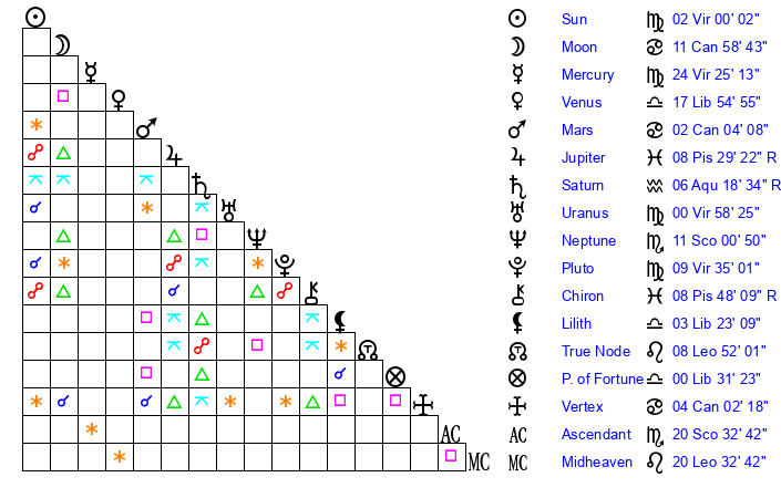 | Sun | 2 Virgo 0 | 2 Virgo 45 | 3 Scorpio 48 |