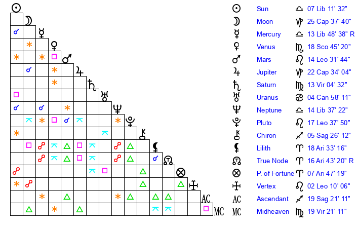 | Saturn | 13 Virgo 32 | 27 Pisces 40 | 19 Virgo 45 |