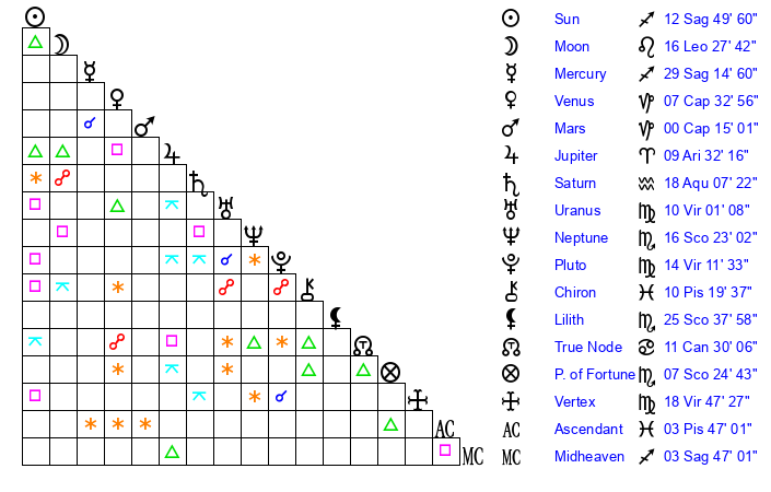 | Sun | 12 Sagittarius 50 | 13 Sagittarius 49 | 15 Aquarius 56 |