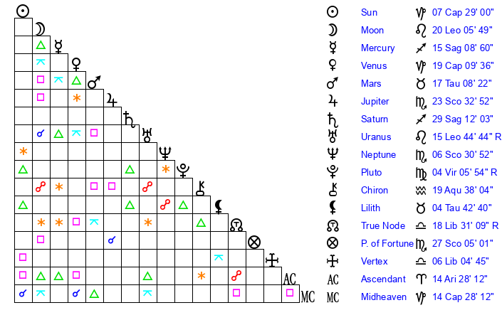| Saturn | 29 Sagittarius 32 | 25 Pisces 57 | 6 Capricorn 4 |