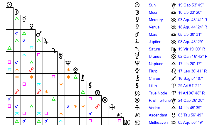 | Neptune | 17 Libra 20 | 27 Pisces 27 | 16 Libra 16 |
