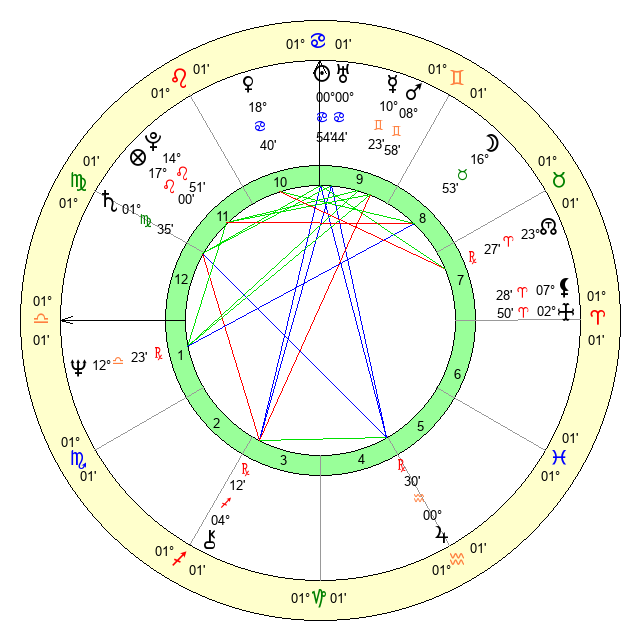 | Sun | 0 Cancer 55 | 1 Cancer 31 | 13 Virgo 45 |