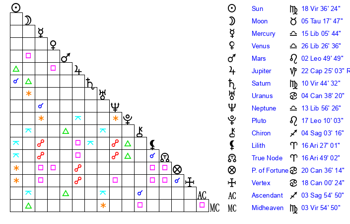 | Saturn | 11 Virgo 12 | 29 Pisces 7 | 18 Virgo 55 |