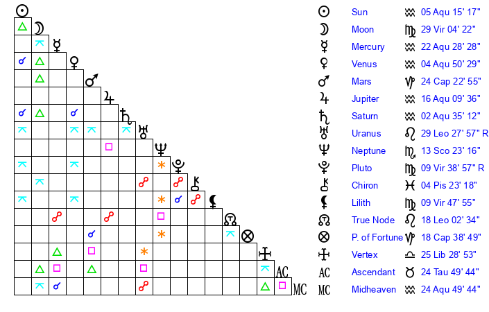 | Pluto | 9 Virgo 38 | 1 Aquarius 51 | 8 Virgo 6 |