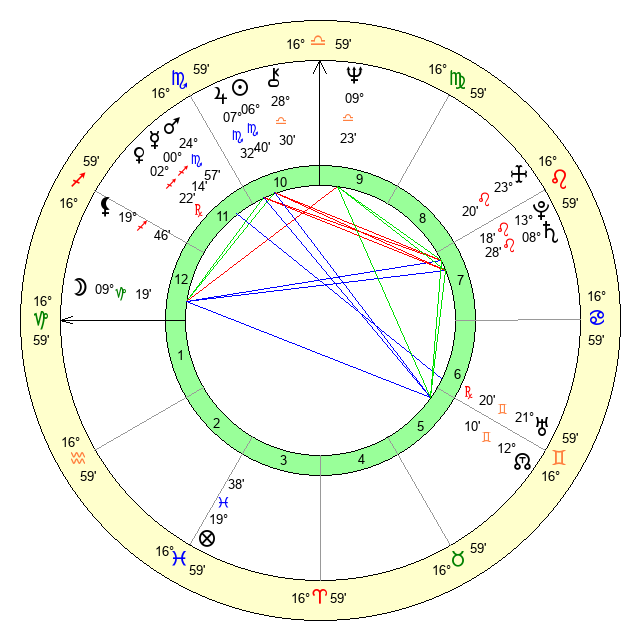 | Sun | 6 Scorpio 40 | 7 Scorpio 31 | 26 Capricorn 45 |