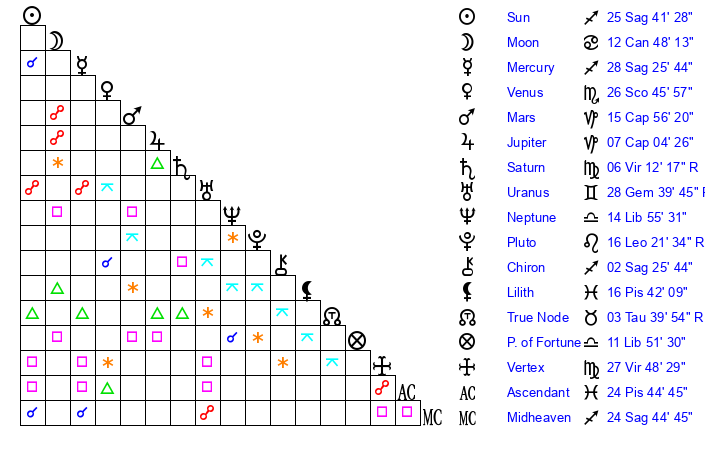 | Sun | 25 Sagittarius 41 | 26 Sagittarius 0 | 13 Pisces 48 |