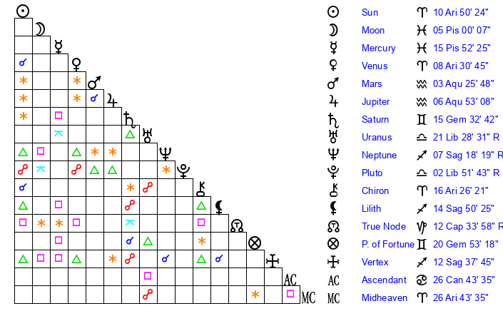 Sun | 10 Aries 50 | 11 Aries 14 | 1 Gemini 26 |