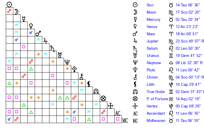 Sun | 14 Taurus 7 | 15 Taurus 12 | 28 Cancer 48 |