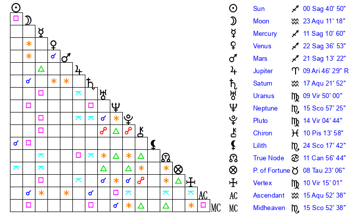 | Sun | 0 Sagittarius 41 | 1 Sagittarius 39 | 3 Aquarius 45 |