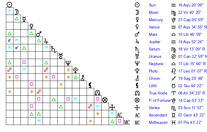 | Sun | 16 Aquarius 20 | 17 Aquarius 9 | 1 Taurus 1 |