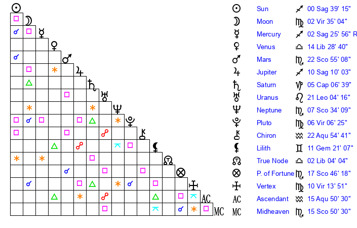 | Sun | 0 Sagittarius 39 | 1 Sagittarius 39 | 7 Aquarius 47 |