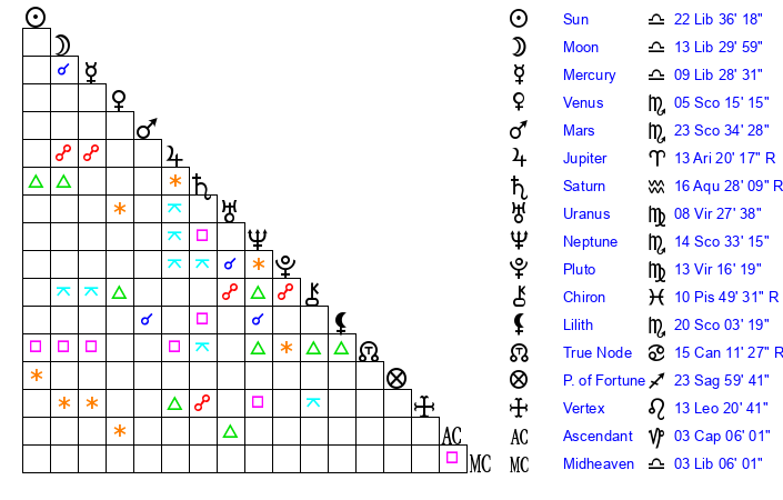 | Moon | 13 Libra 26 | 29 Leo 20 | 12 Capricorn 59 |
