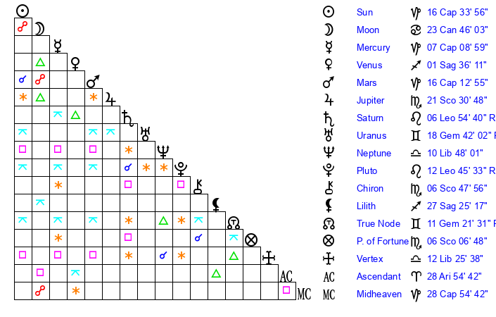 | Neptune | 10 Libra 48 | 27 Pisces 24 | 9 Libra 33 |