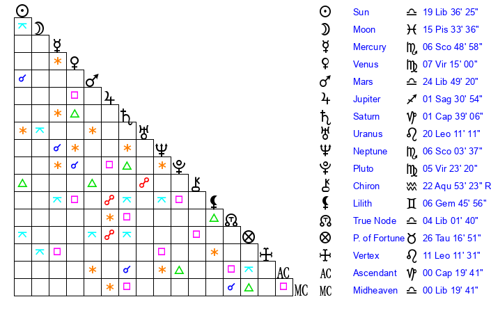 | Sun | 19 Libra 36 | 20 Libra 36 | 26 Sagittarius 2 |