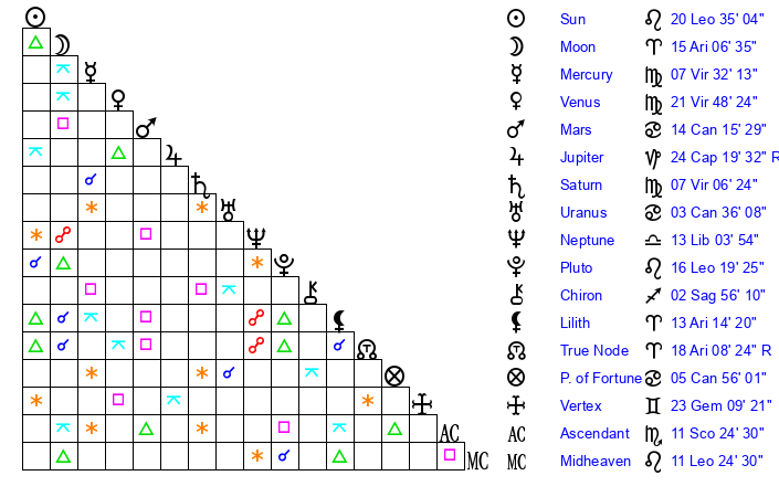 | Pluto | 16 Leo 19 | 2 Aquarius 7 | 18 Leo 5 |